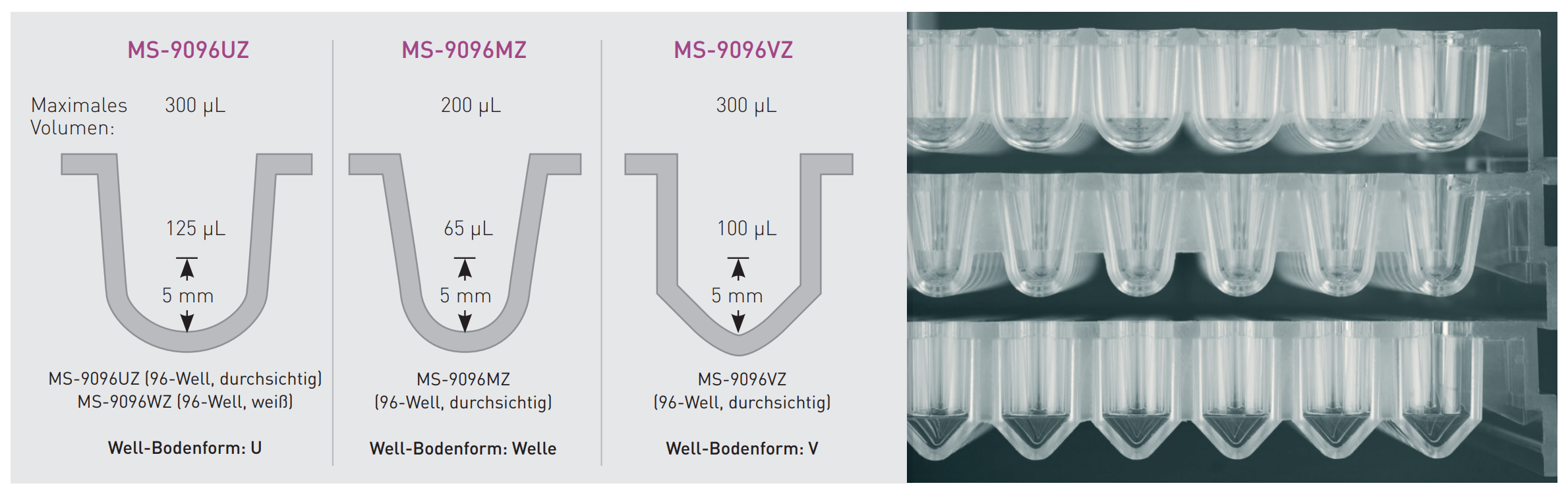 - Verschiedene Bodenformen der Wells verfügbar: U-Form, Wellenform und V-Form im 96-Well-Format