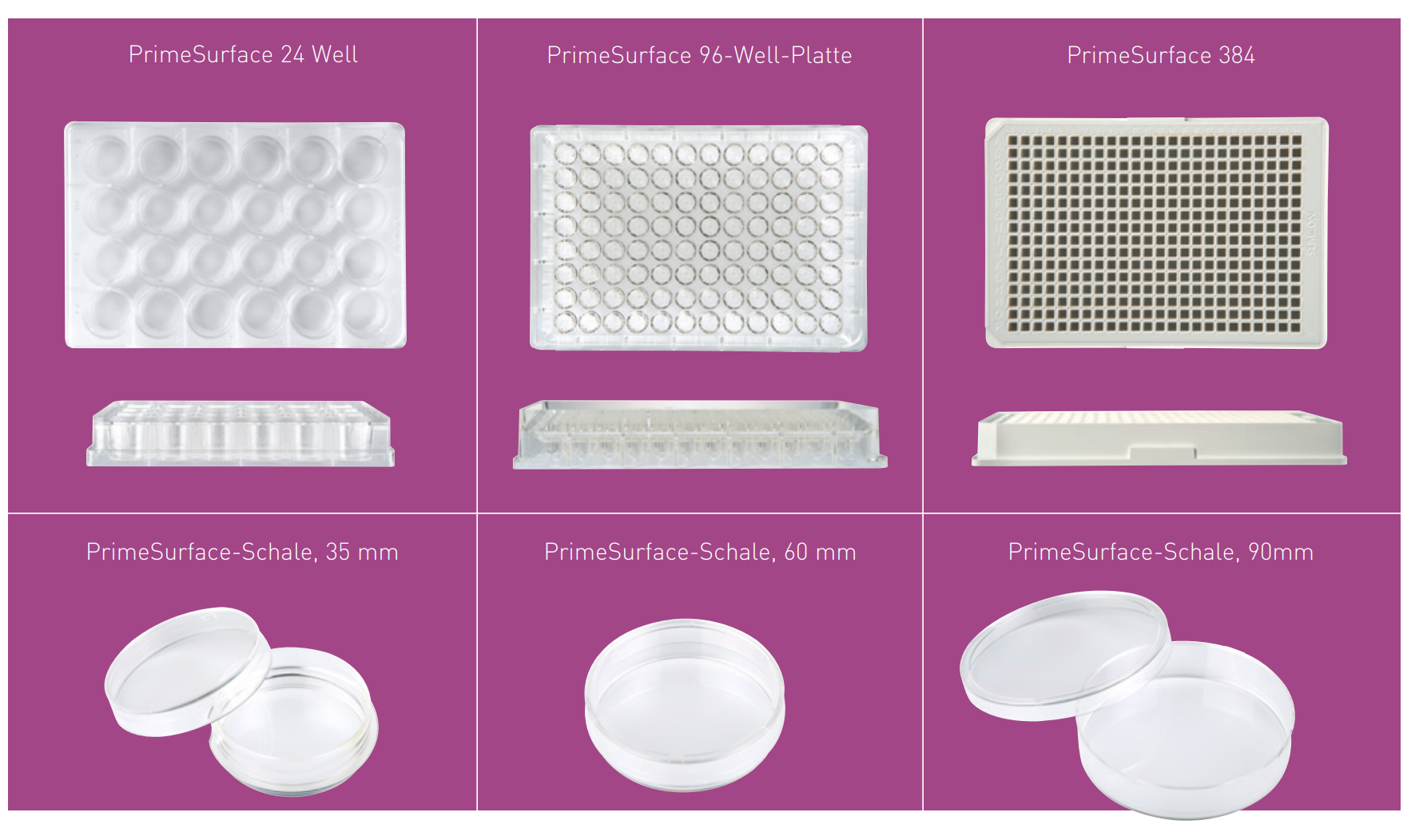 Bei den PrimeSurface Zellkultur-Laborutensilien handelt es sich um ULA (ultra low attachment)- Schalen und -Platten, die eine trägerfreie Selbstorganisation der Sphäroid-Bildung fördern. Die Platten sind mit einem einzigartigen ultrahydrophilen Polymer beschichtet, das die spontane Sphäroid-Bildung in einheitlicher Größe und Form ermöglicht. Die ULA-Platten verfügen über eine hohe optische Durchsichtigkeit, weshalb sie sich insbesondere für Hellbildaufnahmen und die Konfokalmikroskopie eignen. Als Ergänzung zu den häufig eingesetzten 96-Wells mit U-Boden stehen auch 96-Wells mit V- und M-Böden zur Verfügung, um so eine größere Auswahl dichterer Sphäroide zu ermöglichen, die für bestimmte Zellarten erforderlich sind. Für das Hochdurchsatz-Screening (HTS) stehen auch 384-Well-Platten in weiß und durchsichtig zur Verfügung