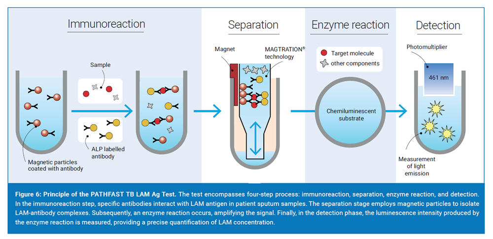 Le test PATHFAST™ TB LAM Ag utilise une technologie avancée pour détecter et quantifier le LAM qui est l'élément spécifique présent sur la paroi cellulaire de Mycobacterium tuberculosis dans les échantillons de crachat des patients. Le LAM est libéré durant l'infection active de la TB. Le test utilise des anticorps spéciaux qui créent un signal visible pour indiquer la réussite du traitement de la TB. L'analyseur PATHFAST™ emploie une technologie utilisant des particules magnétiques dans l'embout de pipette. Durant le test, l'échantillon interagit avec les anticorps en question et les particules magnétiques. Après l'élimination des substances indésirables, on ajoute une substance chimiluminescence (CDP-star). La luminosité produite durant le test est utilisée pour calculer la concentration de LAM dans l'échantillon.