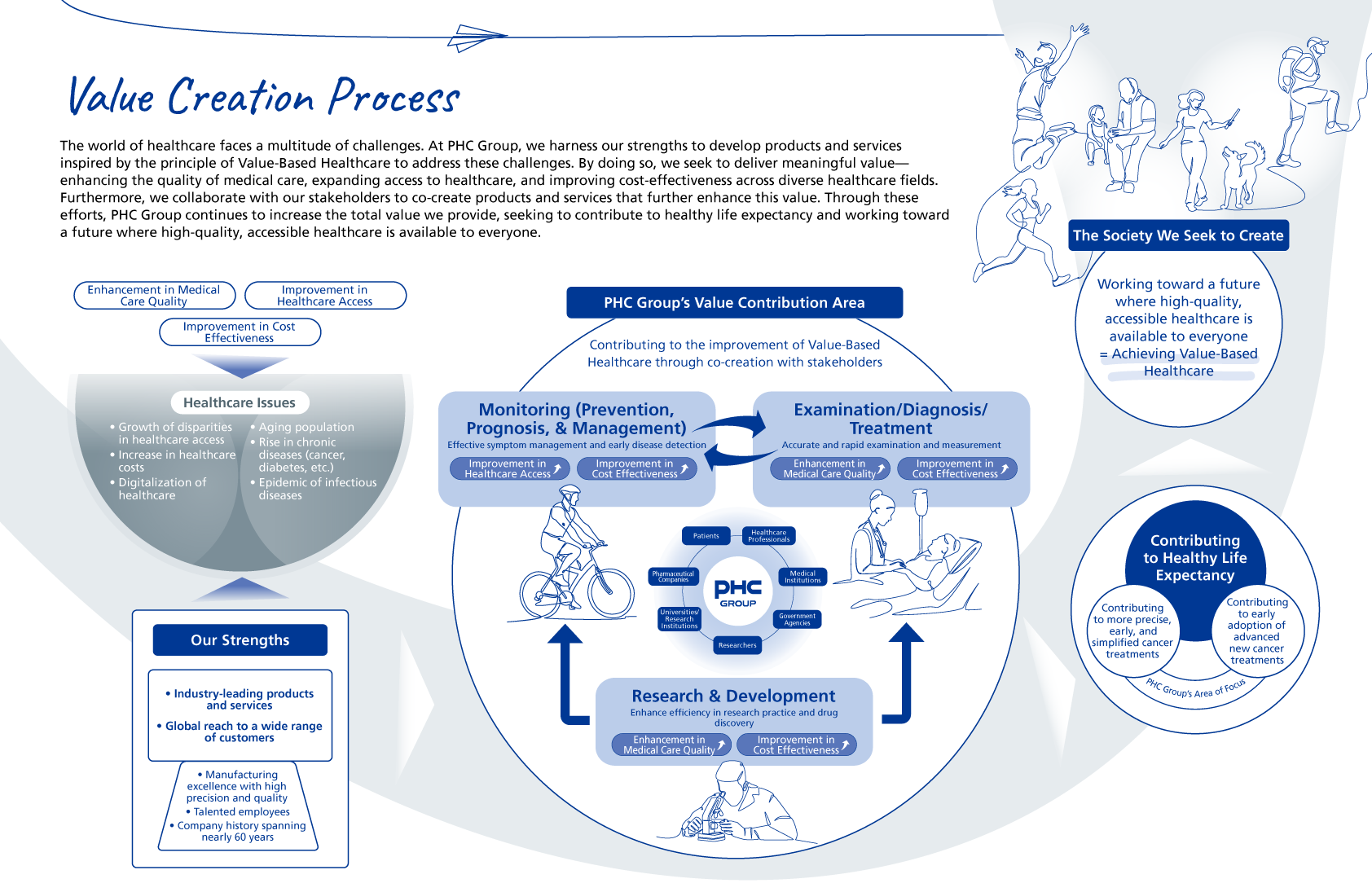 The world of healthcare faces a multitude of challenges. At PHC Group, we harness our strengths to develop products and services inspired by the principle of Value-Based Healthcare to address these challenges. By doing so, we seek to deliver meaningful value—enhancing the quality of medical care, expanding access to healthcare, and improving cost-effectiveness across diverse healthcare fields. Furthermore, we collaborate with our stakeholders to co-create products and services that further enhance this value. Through these efforts, PHC Group continues to increase the total value we provide, seeking to contribute to healthy life expectancy and working toward a future where high-quality, accessible healthcare is available to everyone.