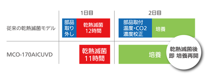 器内温度の立ち上がりが早く、温度分布のバラつきを低減した構造設計により、約11時間 180℃の乾熱滅菌を可能にしました。内装部品の耐熱性アップにより乾熱滅菌時もUVランプや内装部品の取外しも不要。滅菌後の温度・CO₂ガス濃度の再校正も不要となり、滅菌後すぐに、通常培養を再開できます。