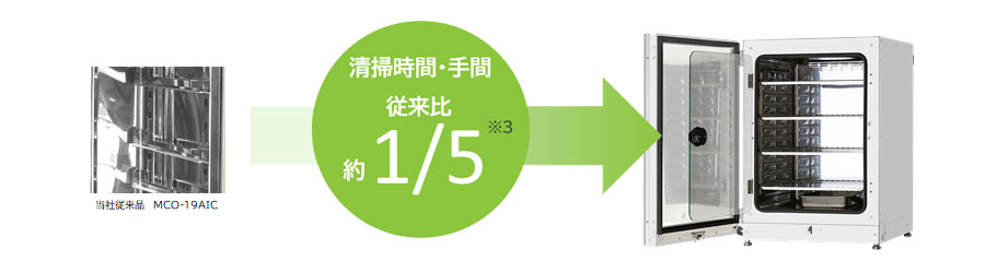 内装部品点数の削減で、細胞培養の切り替え時などの清掃時間を大幅に削減。清掃時間 従来比約1/5。