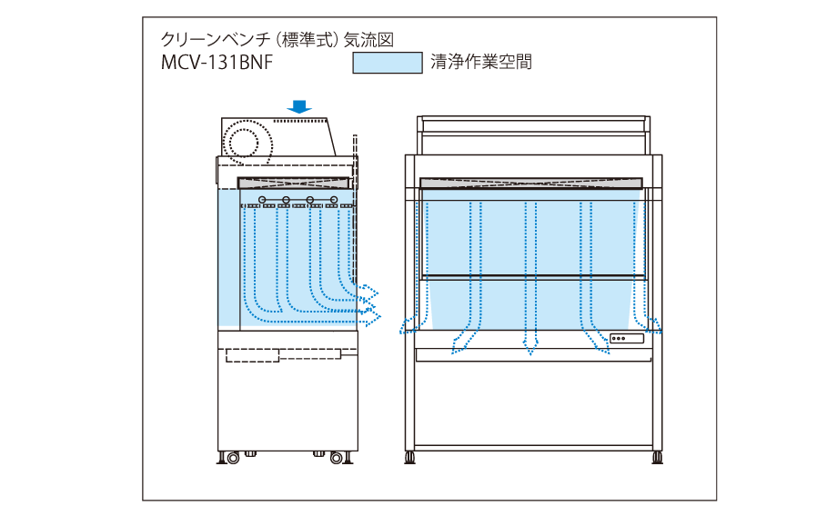 ワークエリアは、取扱いが容易な陽圧タイプです。奥行610mm×高さ680mmのワイドな作業スペースで、高い清浄度を必要とする理化学の各種実験をはじめ、工業用・調剤用にも使えます。