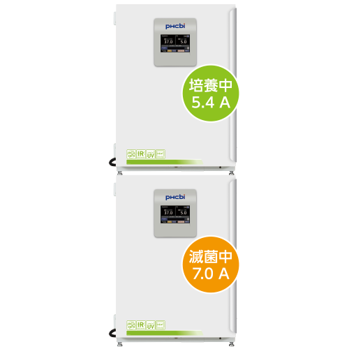 耐熱性に優れたシングルヒーターで、培養時は5.4 A、乾熱滅菌時は7.0 Aで運転、「最大電流」を低減します。