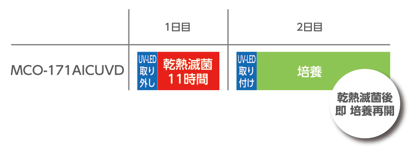 器内温度の立ち上がりが早く、温度分布のバラつきを低減した構造設計により、約11時間180℃の乾熱滅菌を可能にしました。 滅菌後の温度・CO2ガス濃度の再校正も不要となり、滅菌後すぐに、通常培養を再開できます。