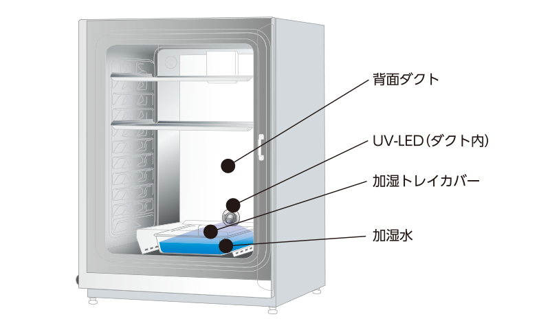 背面ダクト内に設置し、扉閉後、一定時間点灯加湿水を殺菌します。