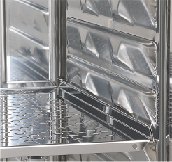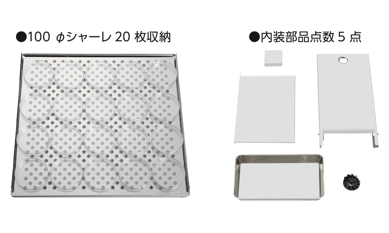 棚受け部分と内箱を一体化することで、少ない内装部品点数で、器内の清掃が簡単、スムーズ 、作業性が向上。また1枚のトレイに、100φシャーレが20枚設置可能 。高い清掃性と収納効率を実現しました。