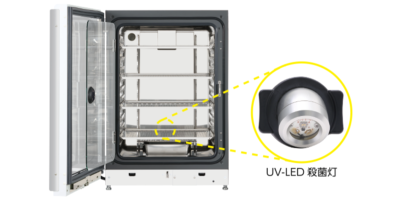 殺菌灯を長寿命のLED にすることで、製品の扉を1日30回開閉する使用条件下でも、殺菌灯の定期交換が不要になります。(故障の場合を除く)殺菌灯は背面ダクト内に設置、加湿水へのみ照射。 さらに加湿トレイカバーが培養エリアへのUV漏れを抑制するため、培養物へは影響がありません。