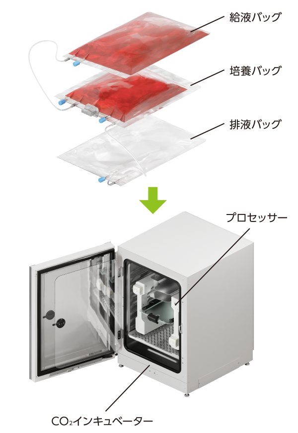 プロセッサーはお持ちのCO₂インキュベーター内に設置します。温度やCO₂濃度の制御は、CO₂インキュベーターが行うため、信頼性・再現性の高い環境で培養可能です。