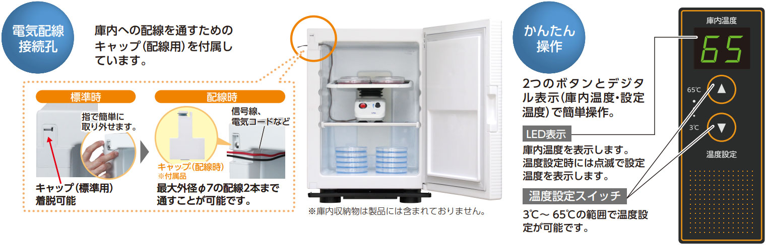 庫内手前間口に装着します。 ポリカーボネート樹脂採用により、装着状態で試料観察が可能で、庫内温度変化を低減できます。