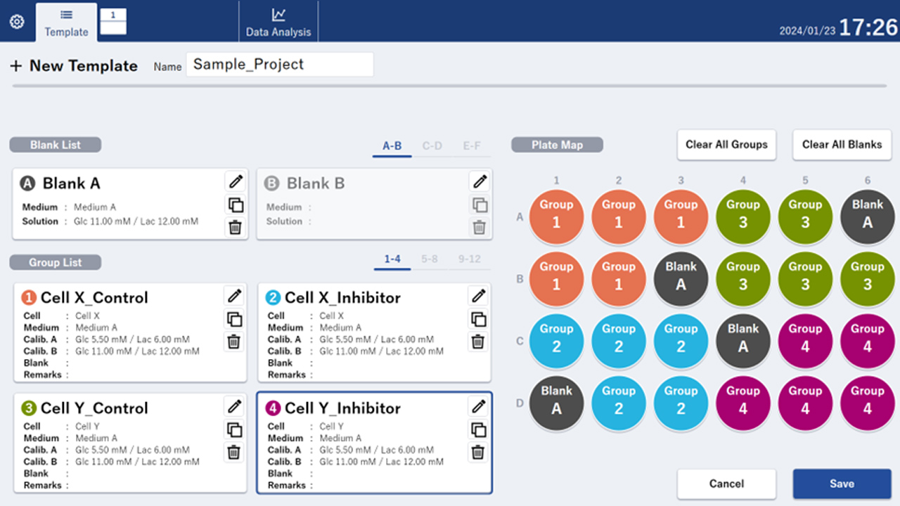 また、キャリブレーションを行なう際はソフトウェア内のアッセイテンプレートを作成する必要があります。アッセイテンプレートには、細胞や培地等の情報とウェル配置を入力します。 アッセイテンプレートを作成するには、測定対象となる培地(測定培地)をベースに作成したキャリブレーション溶液のグルコース濃度と乳酸濃度が必要です。