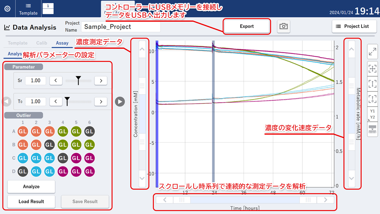 コントローラーによるデータの解析及びスクリーンショットの取得が可能です。 また、データ解析後に、濃度の連続データと代謝速度データをCSVファイルとして出力し、USBメモリを使用してコントローラーからデータを取り出すことが可能です。
