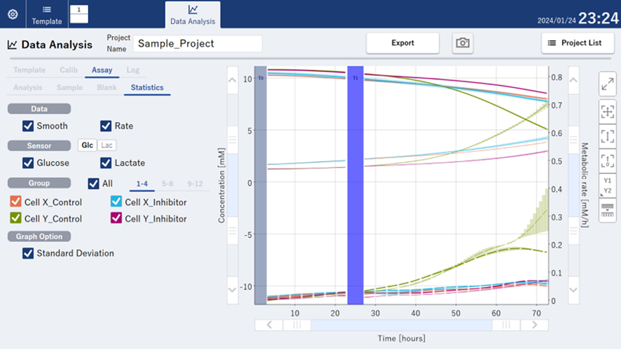 まず、細胞を測定する前に、グルコースと乳酸の検量線を作成するために2種類の濃度既知培地を測定し校正を行います。測定中は、培地交換や継代、試薬の添加など通常の培養作業が可能です。測定データは1分おきに取得され、そのデータをもとに15分おきの代謝速度のデータを導出することができます。