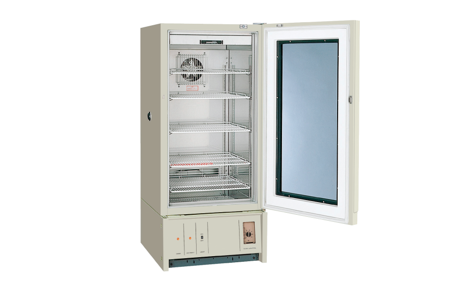 そんなご要望にお応えするのが遮光扉付薬用保冷庫MPR-504Hです。3重ガラス+遮光アクリル板で、光線をカットします。在庫の確認は、庫内の蛍光灯を点灯するだけ。庫内温度は2℃〜14℃の広い範囲で調節でき、有効内容積511Lのワイド設計で、遮光を必要とする薬品の大量保存管理が簡単に行なえます。