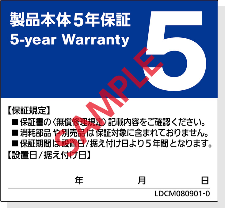 • 5年保証ラベルに記入された日(納品設置日)より5年間が保証期間となります