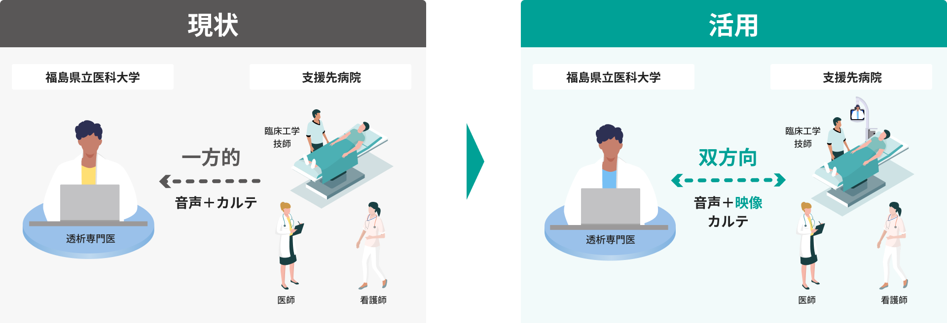福島県内では透析医療の専門医・スタッフが不足している状況です。福島県立医科大学様では情報ネットワークによる遠隔システムを応用し、遠隔透析を立ち上げ、支援されてきました。現在は4箇所の施設を支援されていますが、ここ数年で遠隔透析を必要とする医療機関が増加してきています。そのような状況で、遠隔透析においていくつかの課題を抱えてられていました。 電子カルテの情報を共有しながら対面通話でカンファランスを実施されていますが、電子カルテでは把握できない情報(特に身体所見)は伝わりにくい状況にありました。また、能動的に、かつ、リアルタイムに情報を収集することができず、限られた情報を耳で聞いて理解し、頭で想像しながら方針を決めることが難しい場面もありました。タブレットを用いた回診も実施されましたが、タブレットの不安定性やカメラの性能の限度など不便さを感じる部分もありました。支援先の施設によっては、電子カルテを導入できていない、あるいは完全に移行できていない場合があり、紙媒体からの情報取得が難しい状況にありました。