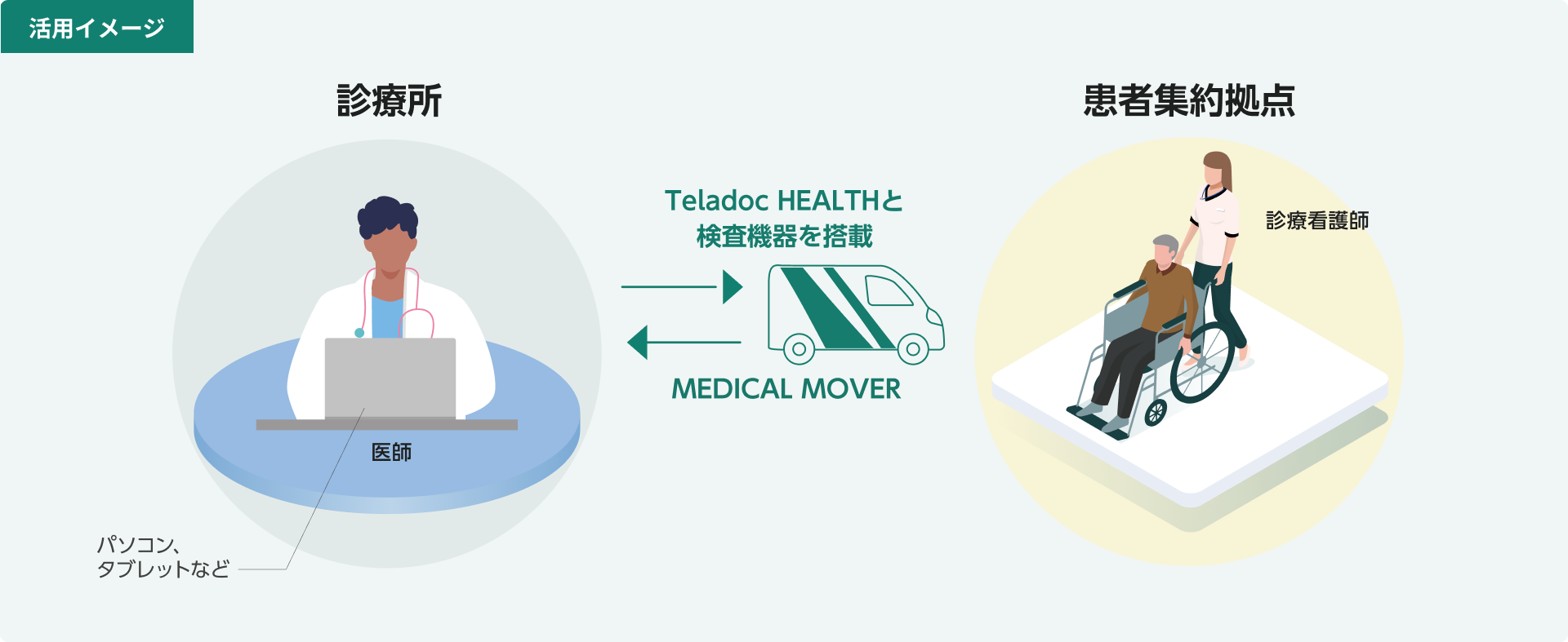 遠隔医療システムと検査機器を搭載した巡回診療車で診療看護師(NP)が公民館などの患者集約拠点を訪問し、遠隔地にいる医師が診察を行います。
