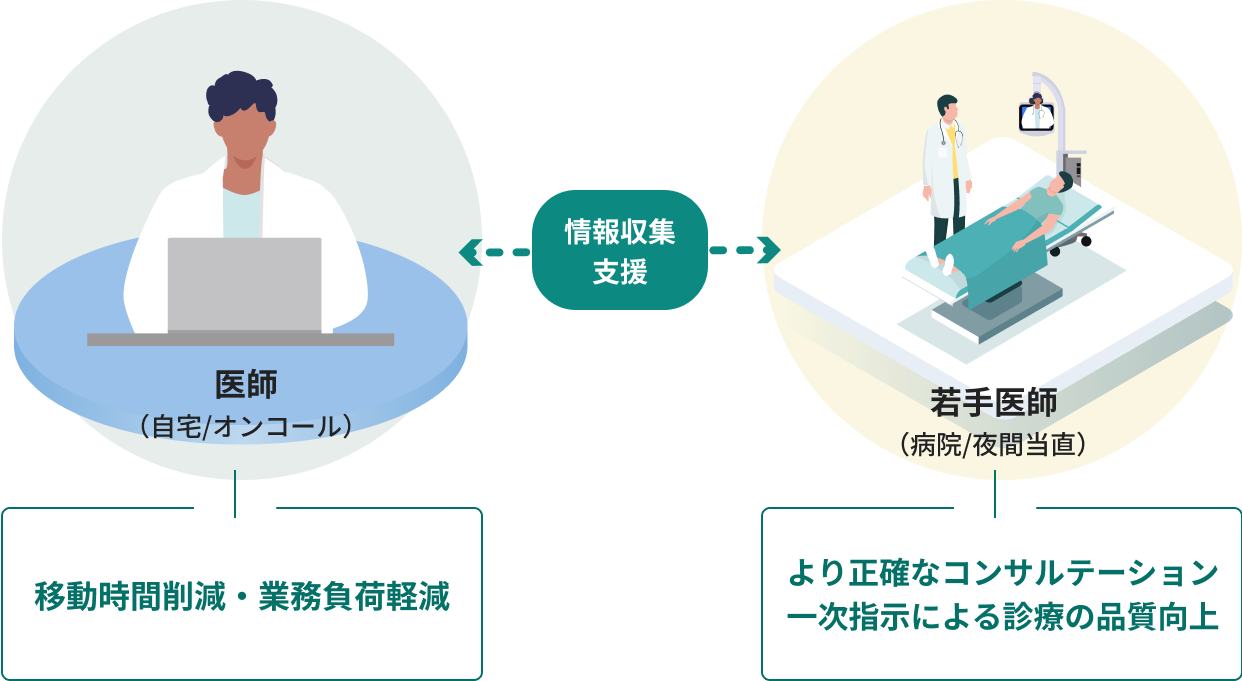 当直医の人数を制限しなければいけない場合等、遠隔から指導医がオンコールでサポートを実施。