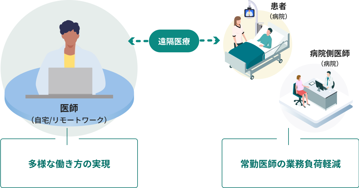 病院でのフルタイム勤務や夜間対応が難しい医師に対し、リモートワークや時短勤務などの多様な働き方を提案。