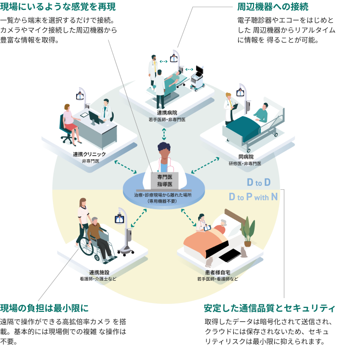 高解像度カメラや周辺機器からの豊富な情報で、どこからでも対面に近い診療を可能に。