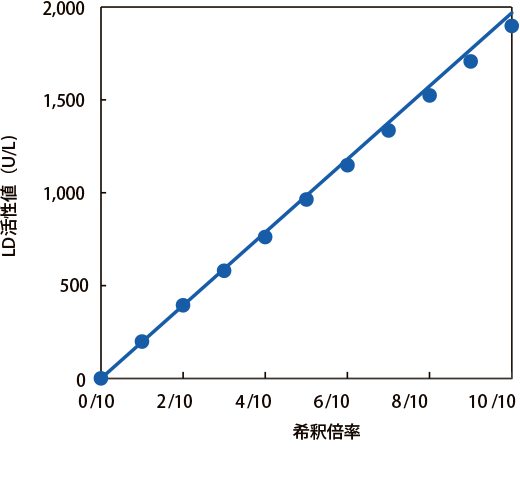 乳酸脱水素酵素キット イアトロ®LD-IF LD-IFとは IFCC標準化対応試薬を用いることで海外と測定値の共有ができ、国際的な臨床試験などに対応できます。また、JSCC標準化対応試薬と比べて健常者の測定値差は軽微であり、現行の共用基準範囲を用いることができます。一方、肝疾患などの乳酸脱水素酵素(LD)5アイソザイム優位検体においてJSCC標準化対応試薬と比べて低値傾向を示します。 測定原理 試薬中の基質L-乳酸は酸化型ニコチンアミドアデニンジヌクレオチド(NAD)の存在下で、検知中のLDによりピルビン酸に変化します。この反応における還元型ニコチンアミドアデニンジヌクレオチド(NADH)の生成速度を測定することでLD活性値を求めます。 相関性 7180形日立自動分析装置での検討結果 オンボードデータ安定性 併行精度(同時再現性) (n=10) (U/L) Sample L Sample M Sample H 平均 61 190 651 最大値 62 191 654 最小値 60 187 646 Range 2 4 8 S.D. 0.6 1.3 3.0 C.V.(%) 1.0 0.7 0.5 直線性 特異性、選択性(共存物質の影響) 基本性能データ7180形日立自動分析装置 製品概要 使用目的:血清又は血漿中の乳酸脱水素酵素活性の測定 商品コード 製品番号 製品名 包装 630354 7C2-03M1-R1 イアトロ LD-IF R-1:60mL×2 630361 7D2-03M1-R2 R-2:15mL×2 840418 7M2-03M1-R1 R-1:540mL×2 840425 7P2-03M1-R2 R-2:140mL×2 800337 LS8-03M1(2) R-1:40mL×2 R-2:10mL×2 770326 TBA-03M1 R-1:52mL×2 R-2:13mL×2 500961 ST-02MX 酵素キャリブレータープラス 「ヤトロン」 1mL×6本 100352 RM100-35 酵素コントロールプラス1・2 「ヤトロン」 1mL×3×2濃度 適応機種の詳細はお問い合わせください