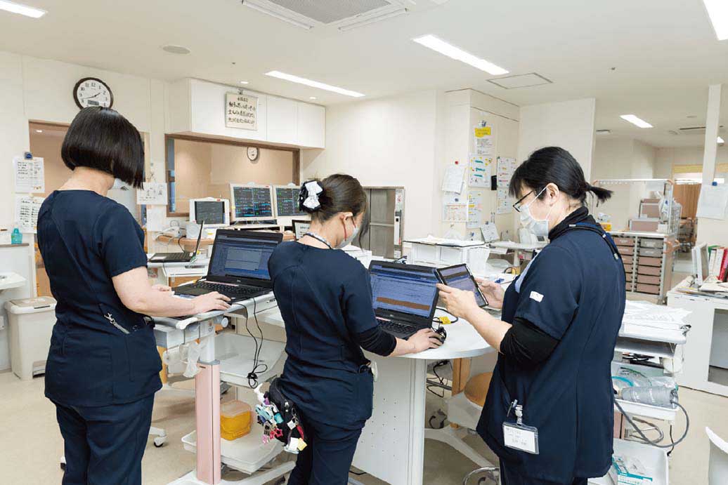 電子カルテを導入した当初の端末台数は40台でしたが、現在、デスクトップやノートPC、タブレットを合わせて60台に増えています。新病棟では無線アクセスポイントが設置され、看護師がカートにノートPCを載せて行き来し、「電子カルテもより使いやすくなったのではないかと思います」と山﨑氏。働きやすさの向上にもつながっています。入院受付と地域連携室はフロアが異なりますが、「タブレットを増やしたことによってどの場所にも持っていけますし、訪問診療などの際には外でも使用できます。本当に利便性が向上しました」と実感しています。