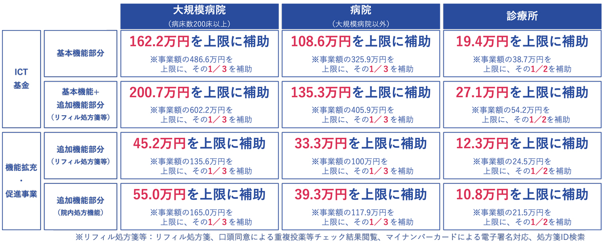 「ICT基金(医療情報化支援基金)」「機能拡充・促進事業」に分かれ、診療所、病院、大規模病院の順で補助金上限額が大きくなっています。なお、令和7年10月以降のICT基金(医療情報化支援基金)における導入補助の取扱いについては、令和7年夏を目処に見直しを行う電子処方箋の新たな目標を踏まえて、改めて検討される予定です。
