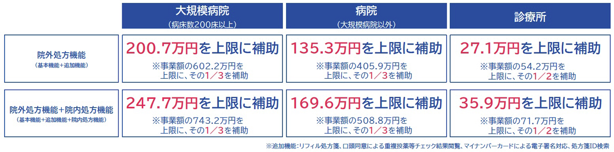 令和7年10月以降の電子処方箋の導入補助について、補助対象とする導入期限を令和8年9月まで延長した上で、令和7年10月以降に導入した施設に対しても補助が実施されます。また、補助対象の機能について、従来の院外処方機能に加えて院内処方機能も補助対象に追加されます。 ※1