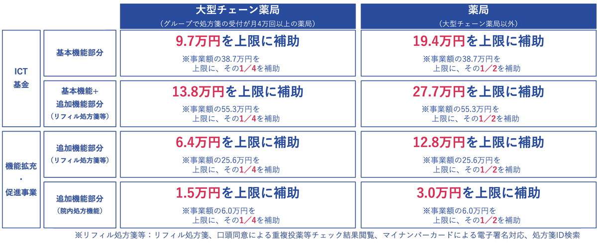 「ICT基金(医療情報化支援基金)」「機能拡充・促進事業」に分かれ、大型チェーン薬局、薬局の順で補助金上限額が大きくなっています。なお、令和7年10月以降のICT基金(医療情報化支援基金)における導入補助の取扱いについては、令和7年夏を目処に見直しを行う電子処方箋の新たな目標を踏まえて、改めて検討される予定です。