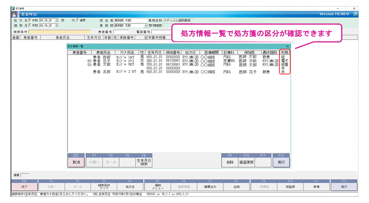 【患者呼出】→補助メニューにて自動転記→【処方情報一覧】→患者さんを選択→新患登録→オンライン資格確認の実施→【患者登録(新患)】(資格確認結果表示)→ 内容を確認し、実行