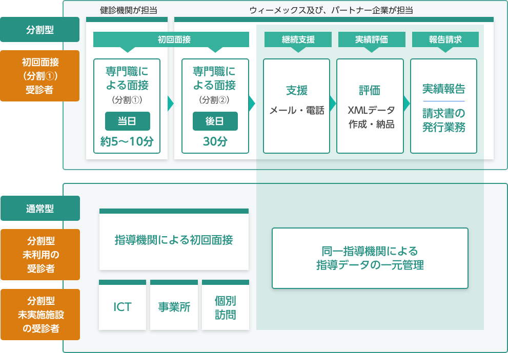 健診機関と連携する「分割型」だけでなく、個別または事業所などに専門職が後日訪問し、対面で面接を行う「通常型」のプログラムもご用意。要望・環境に応じて、自由に組み合わせてご利用いただけます。