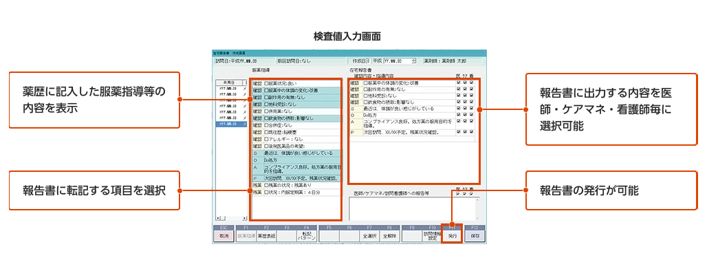 在宅支援機能では、計画書の作成から服薬指導状況の記録、医療機関などへの報告書作成までサポートします。さらにオプションサービス「Pharnes LinkⅡ」をご利用いただくことで薬局の外でも「薬歴」の閲覧・入力ができ、薬局内と同様の画面・操作が可能です。
