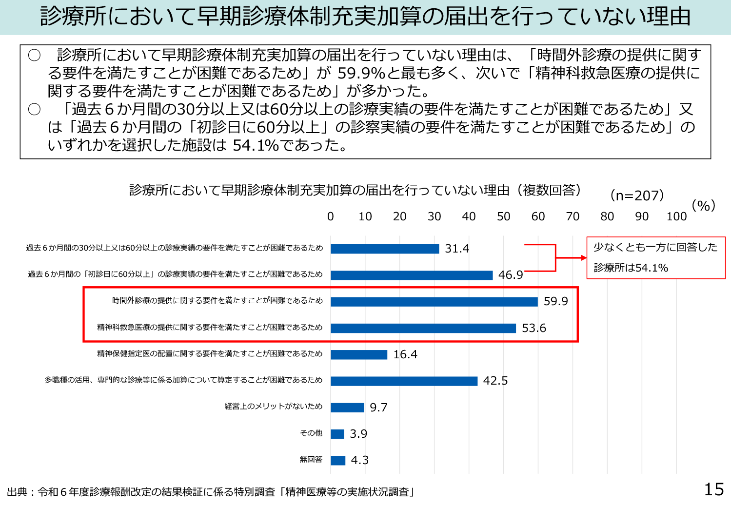 ◆通院・在宅精神療法における初診体制を評価する「早期診療体制充実加算」について、届出医療機関が少ない現状が報告されましたが、特に診療所では、時間外診療や救急医療の要件が課題となっており、地域連携による体制構築を評価対象とする方向が示されました。平日日中のみ診療を行う診療所であっても、救急医療機関との連携体制を整えることで、夜間休日の対応が可能とみなされる新たな仕組みが検討されました。
